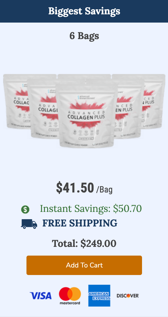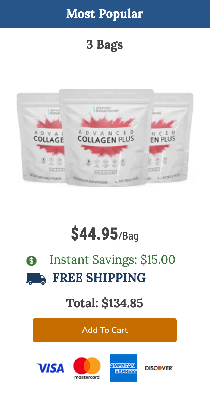 Advanced Collagen Plus is offered in different package options, allowing users to choose based on commitment level and long-term goals. A single bag is priced at $49.95, which is often chosen by first-time users who want to experience how their body responds before committing further.